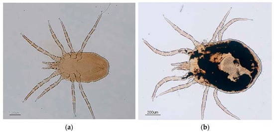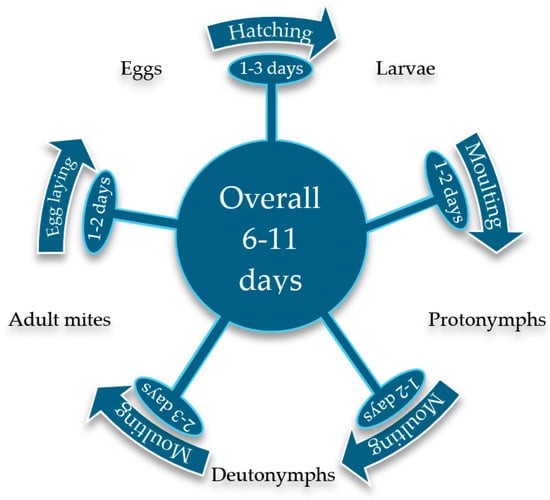 The mite’s life cycle spans 1–2 weeks (Figure 2), starting with an engorged female laying 1–9 eggs, which hatch into larvae in 1–3 days. The larvae moult into mobile protonymphs and, after feeding, into deutonymphs before reaching adulthood. Females can lay 30–200 eggs in their lifetime [10,16,17]. Optimal development occurs at 30 °C, while heat stress at 35 °C reduces reproduction and development speed, suggesting its potential as a control strategy [18].