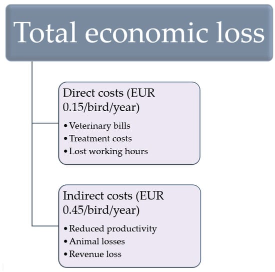 With its huge prevalence in poultry farming, Dermanyssus gallinae’s economic impact is quite substantial. How substantial it is exactly is, however, a mystery as of writing this paper. Economic losses can be broken down into two groups: direct costs and indirect costs (Figure 3). Under direct costs fall a number of expenditures which directly correlate to PRM infestation; these include expenses like veterinary bills, treatments costs, and lost working hours. Indirect costs refer to losses suffered as a consequence of the infestation, such as reduced productivity, decreased revenue, and animal losses [29].