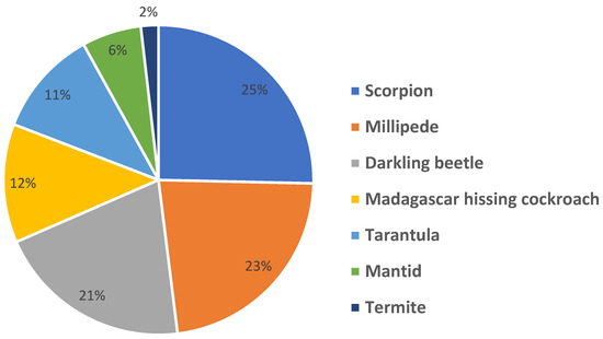 Following the program, 94% of students indicated that they wanted to continue learning more about insects and other arthropods. Furthermore, among the live arthropods introduced during the program, scorpions were the most frequently chosen as students’ favorites, followed by millipedes, darkling beetles, Madagascar hissing cockroaches, tarantulas, mantids, and termites (Figure 1).