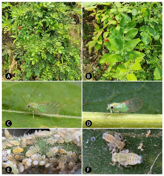 Habitus of Epipsylla suni sp. nov. (A,B) Host plant, Derris taiwaniana; (C,D) adults; (E,F) larvae.