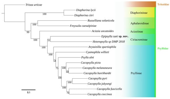 Our phylogenetic analysis supports the placement of Epipsylla in Ciriacreminae, suggested by Burckhardt et al. [], and is generally consistent with the results of Percy et al. [] and Cho et al. []. The close relationship of Epipsylla with Caradocia and Geijerolyma advocated by Burckhardt et al. [] needs further analysis.