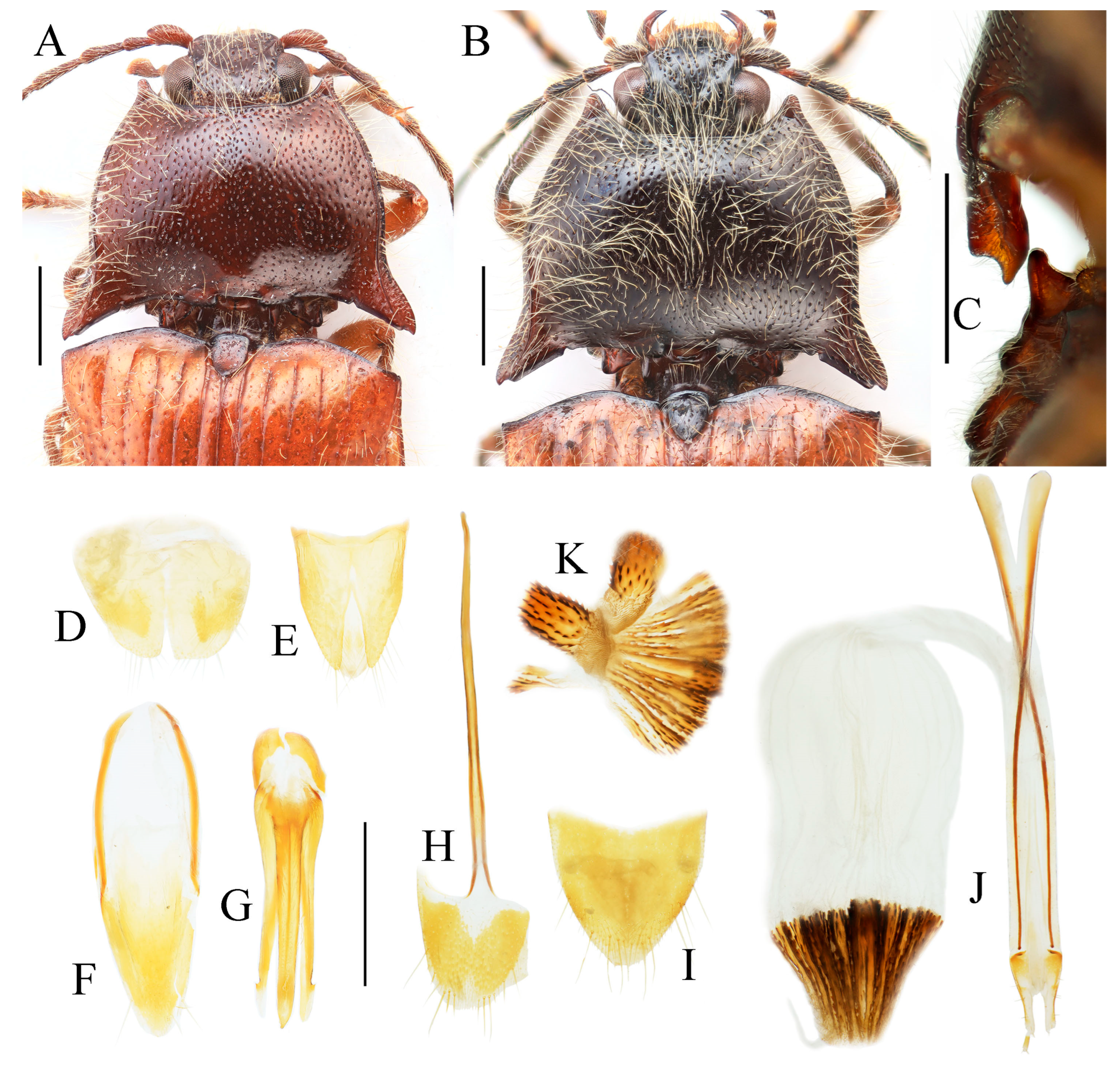 Figure 2H). Eyes prominent, globose. Antennae elongate, extending to/about elytral mid-length in both sexes; scape robust; pedicel shortest; antennomeres III–XI elongate filiform (