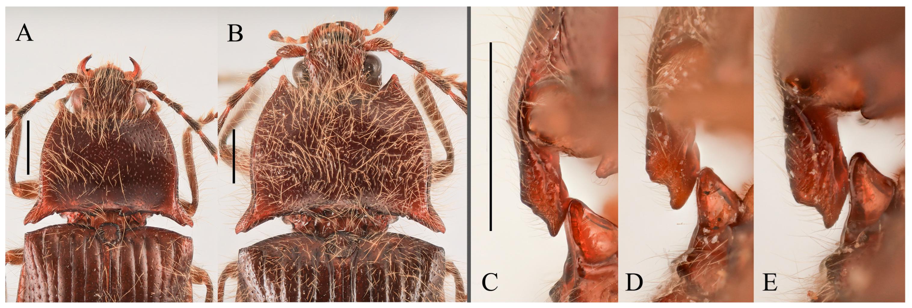 Figure 24D). Anterior angles triangularly protruding, slightly outward, apices rounded. Lateral margins slightly arched at middle. Posterior angles indistinctly bidentate; outer tooth with rounded lateral margin and sharp apex; inner tooth reduced, forming shallow notch with outer tooth. One small notch present near posterior angle. Pronotal punctures separated by flat and smooth intervals, about 5–6 puncture diameters wide.