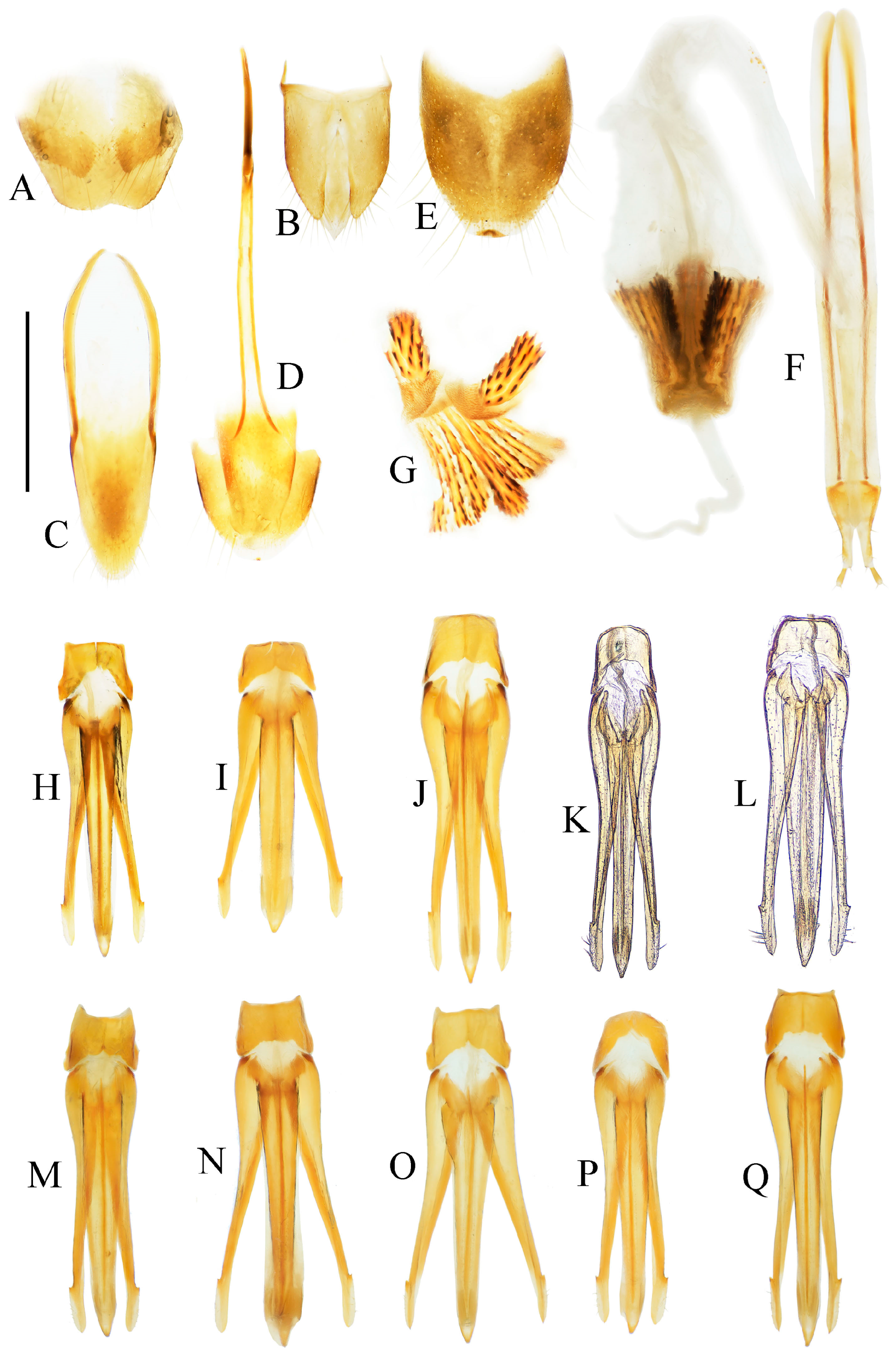 Figure 4A). Tergite IX anterior margin deeply emarginate medially, lobes rounded apically; tergite X slightly surpassing apices of tergite IX (