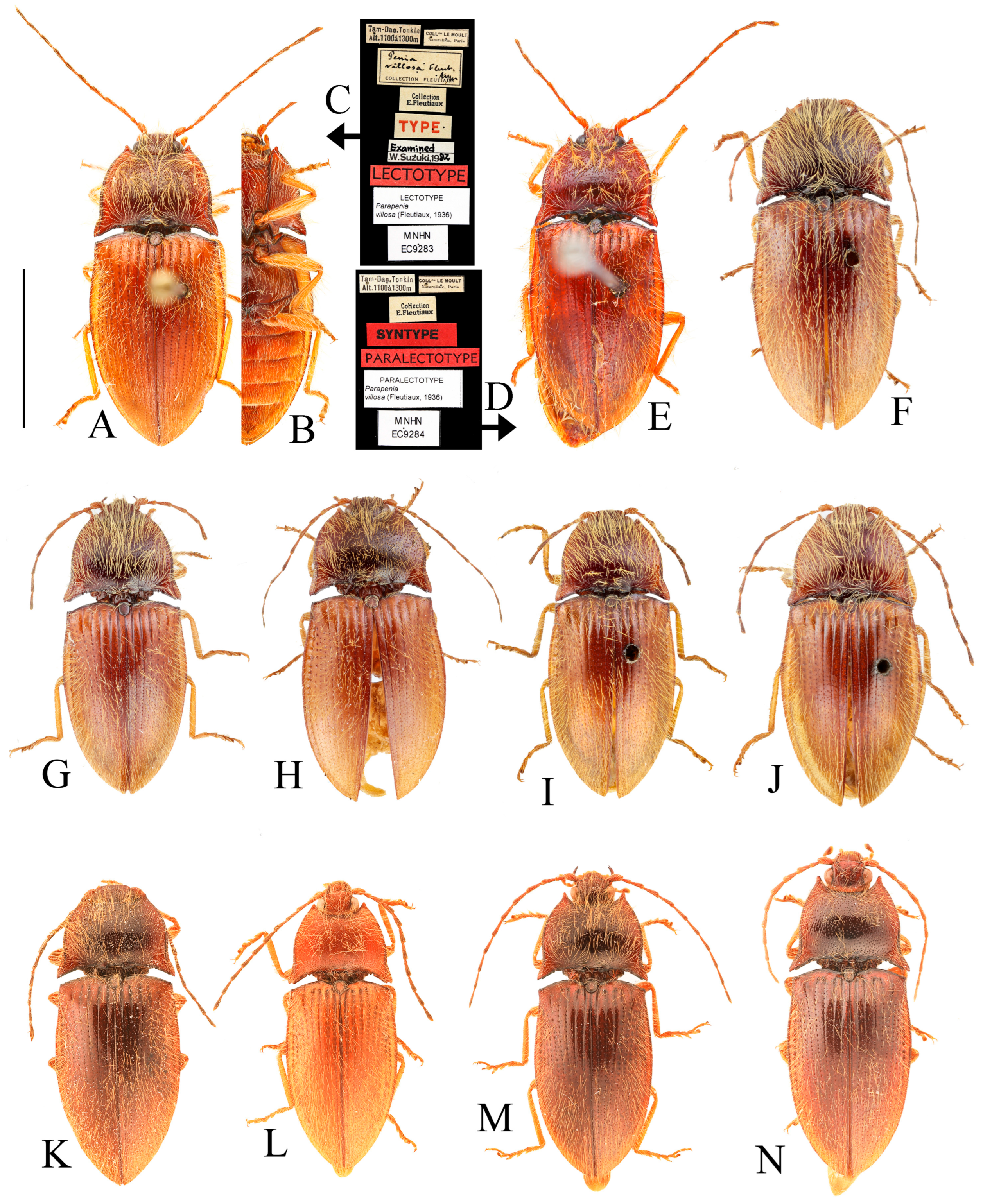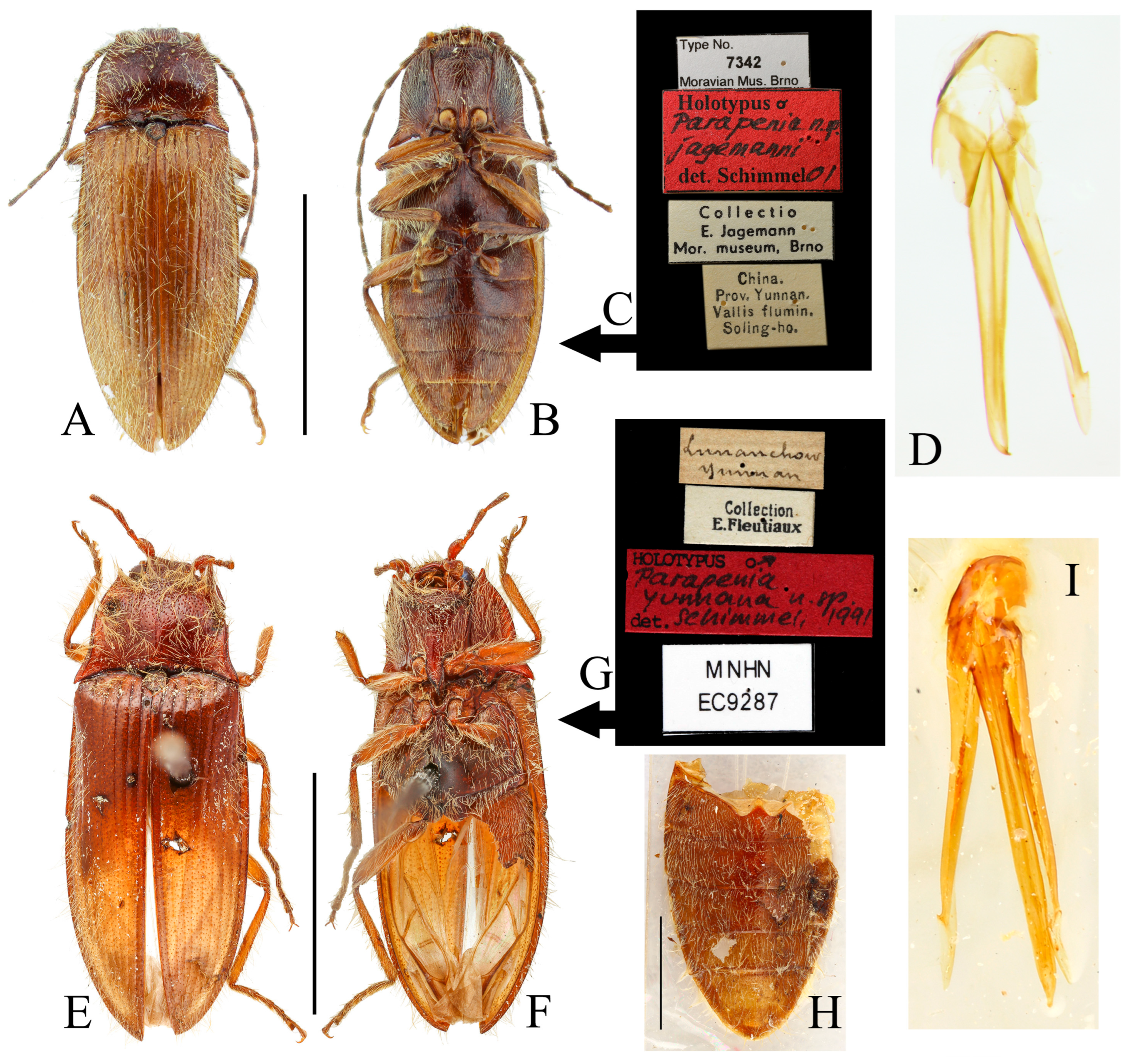 Type material examined. Holotype of Parapenia yunnana Schimmel, 1993, male (MNHN), “HOLOTYPUS [print] ♂/Parapenia [handwriting] /yunnana n. sp. [handwriting]/det. [print] Schimmel, 1991 [handwriting]”, “Collection [handwriting]/E. Fleutiaux [print]”, “lunanchow [=Lunan Zhou, now Shilin County near Kunming City]/yunnan” [handwriting], “MNHN EC9287” [print]. Holotype of Parapenia jagemanni Schimmel, 2001: male (MZMB), “Holotypus ♂ [print]/Parapenia n. sp. [handwriting]/jagemanni [handwriting]/det. Schimmel [print] 01 [handwriting]”, “Collectio/E. Jagemann/Mor. Museum, Brno” [print], “China./Prov. Yunnan,/Vallis flumin./Soling-ho.” [print], “Type No./7342/Moravian Mus. Brno” [print].