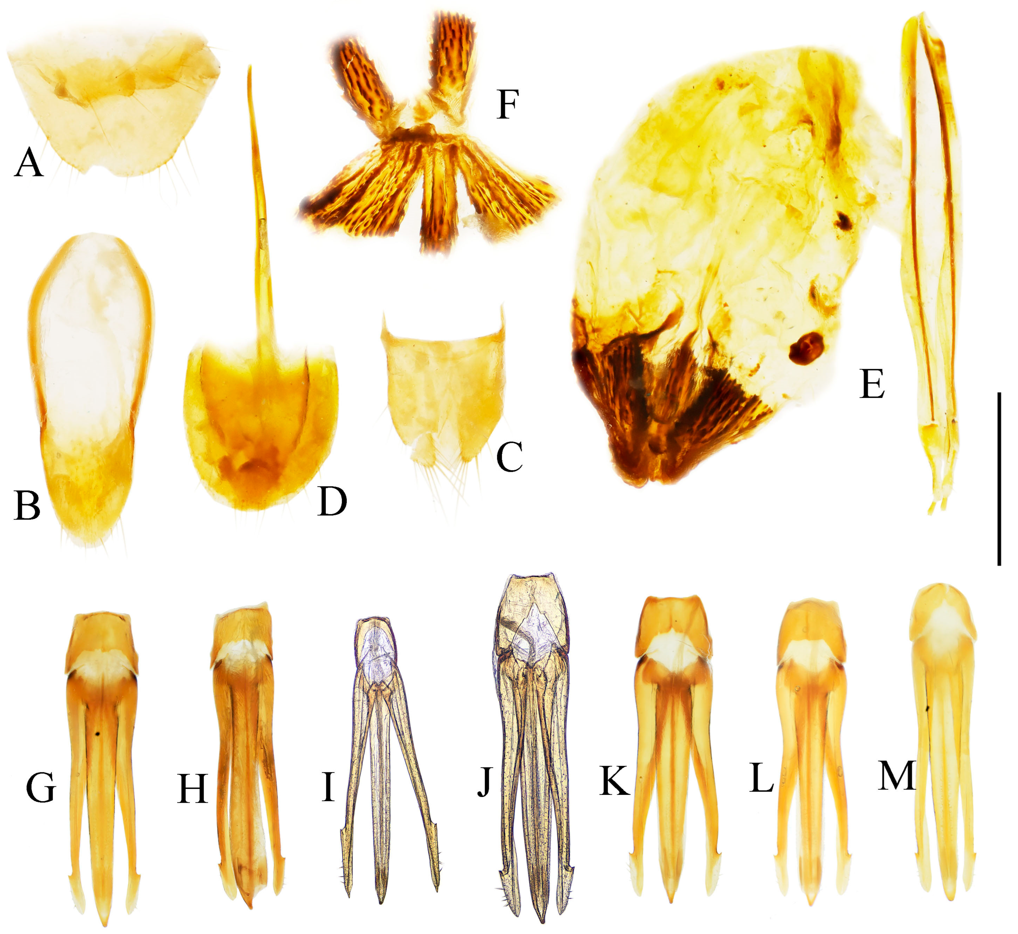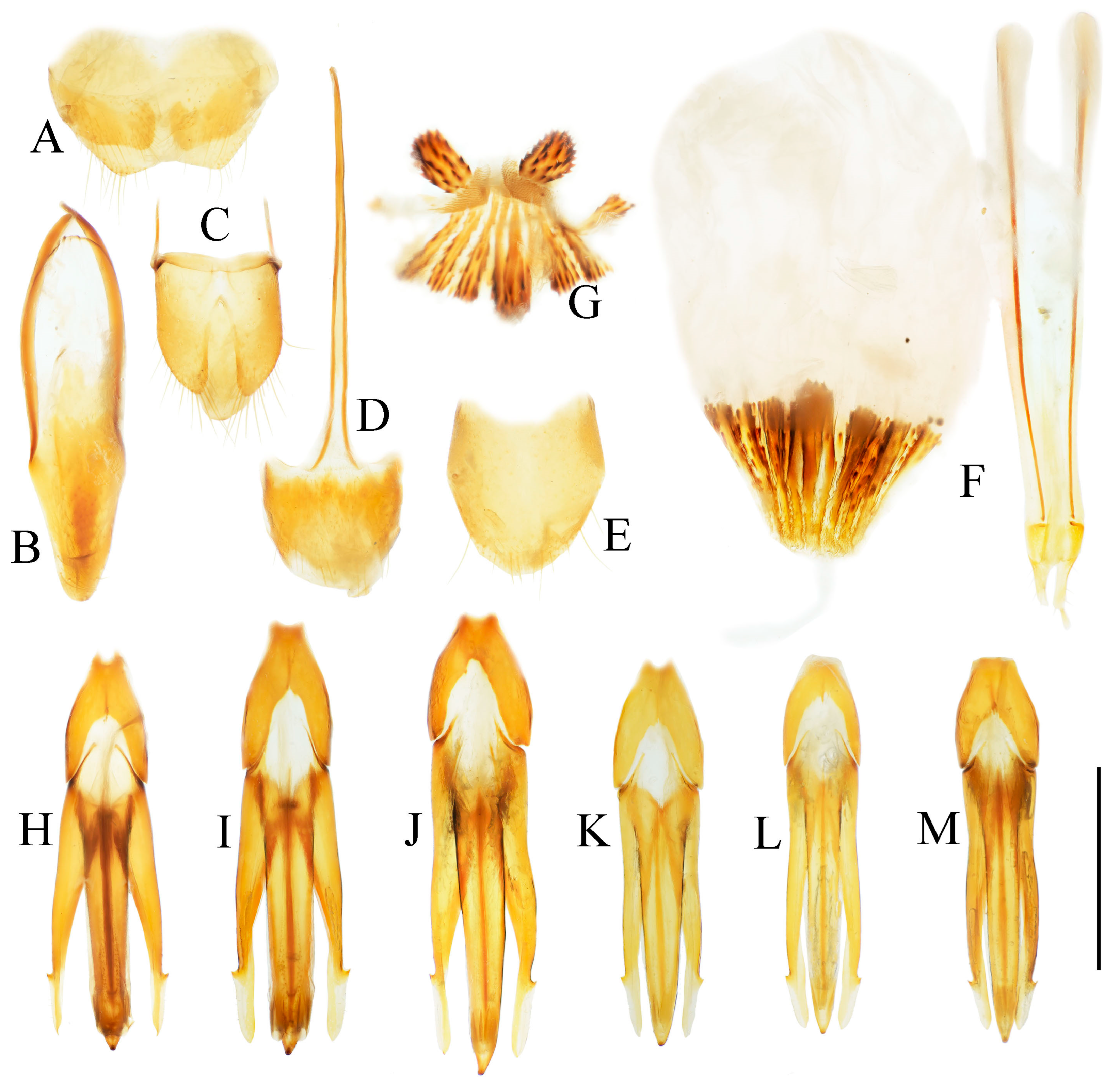 Pregenital segments and genitalia of Parapenia wulingshanensis, male ((A–C) from Guangdong, Nanling Mountain, (H–M) from various localities) and female ((D–G) from Nanling Mountain). (A) Sternite VIII and tergite VIII, ventral view; (B) sternite IX, dorsal view; (C) tergites IX–X, dorsal view; (D) sternite VIII dorsal view; (E) tergite VIII, dorsal view; (F) ovipositor and genital tract, ventral view; (G) sclerotized part of bursa copulatrix; (H–M) aedeagi, ventral view: (H,I) Nanling Mountain; (J) Guangxi, Damingshan Mountain; (K) Hunan, Mangshan N.R.; (L) Fujian, Dehua; (M) Zhejiang, Fengyangshan mountain. Scale bar 1 mm.