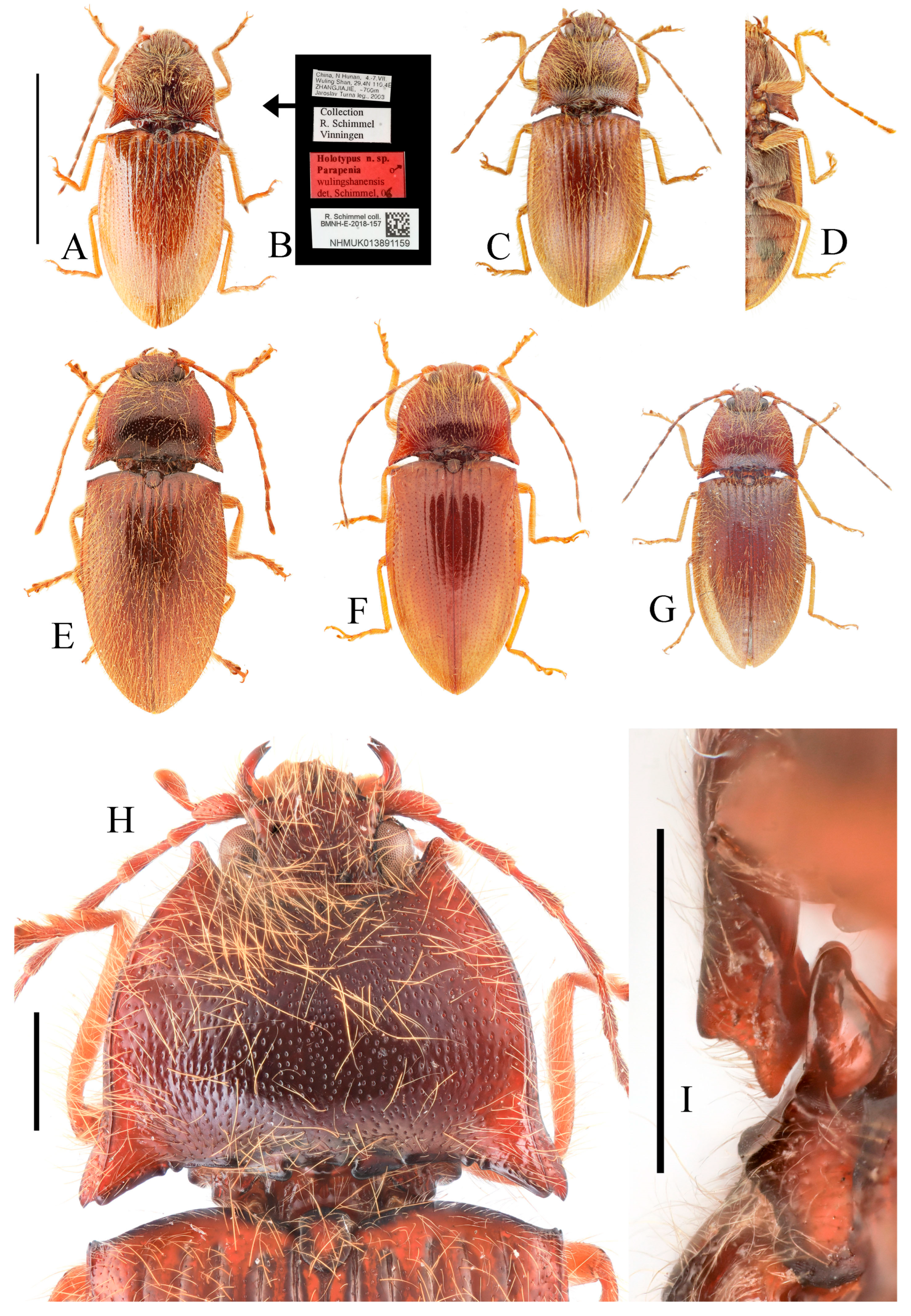 Parapenia wulingshanensis. (A,B) Holotype, male: (A) dorsal view; (B) labels; (C,D) paratype, female: (C) dorsal view; (D) ventral view; (E) male from Guangxi, Damingshan Mountain, dorsal view; (F,G) individuals from Guangdong, Nanling Mountain, dorsal view: (F) male; (G) female; (H) head and pronotum, male from Hunan, Dupangling mountain, dorsal view; (I) prosternal process, same male from Dupangling, lateral view. (A,B) photographed by Keita Matsumoto, copyright BMNH. Scale bars 5 mm for (A–G); 1 mm for (H,I).