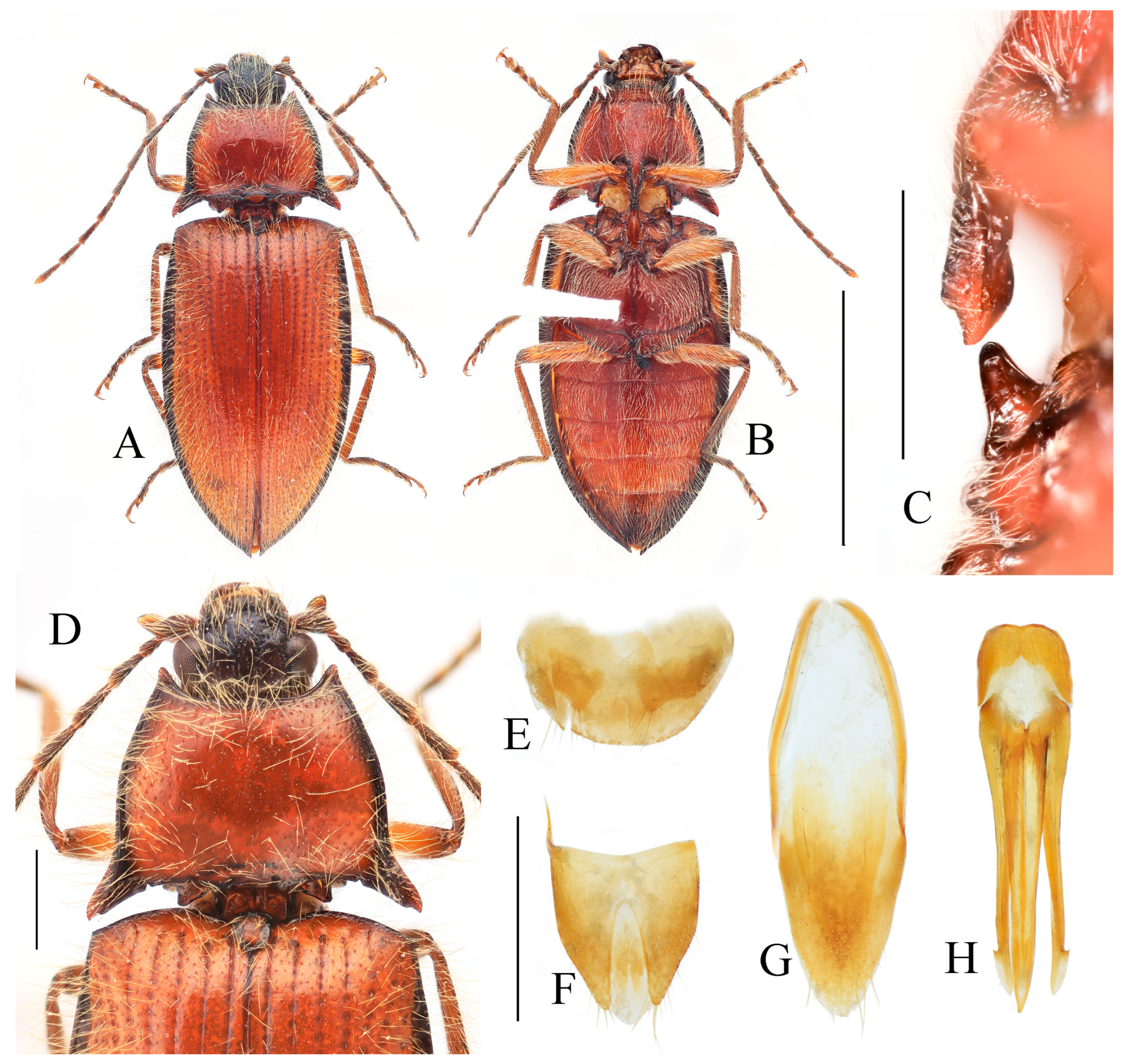 Parapenia zhengi sp. nov., male, holotype from Xizang, Zayü. (A) Habitus, dorsal view; (B) same, ventral view; (C) prosternal process, lateral view; (D) head and pronotum, dorsal view; (E) sternite VIII and tergite VIII, ventral view; (F) tergites IX–X, dorsal view; (G) sternite IX, dorsal view; (H) aedeagus, ventral view. Scale bars 5 mm for (A,B); 1 mm for (C–H).