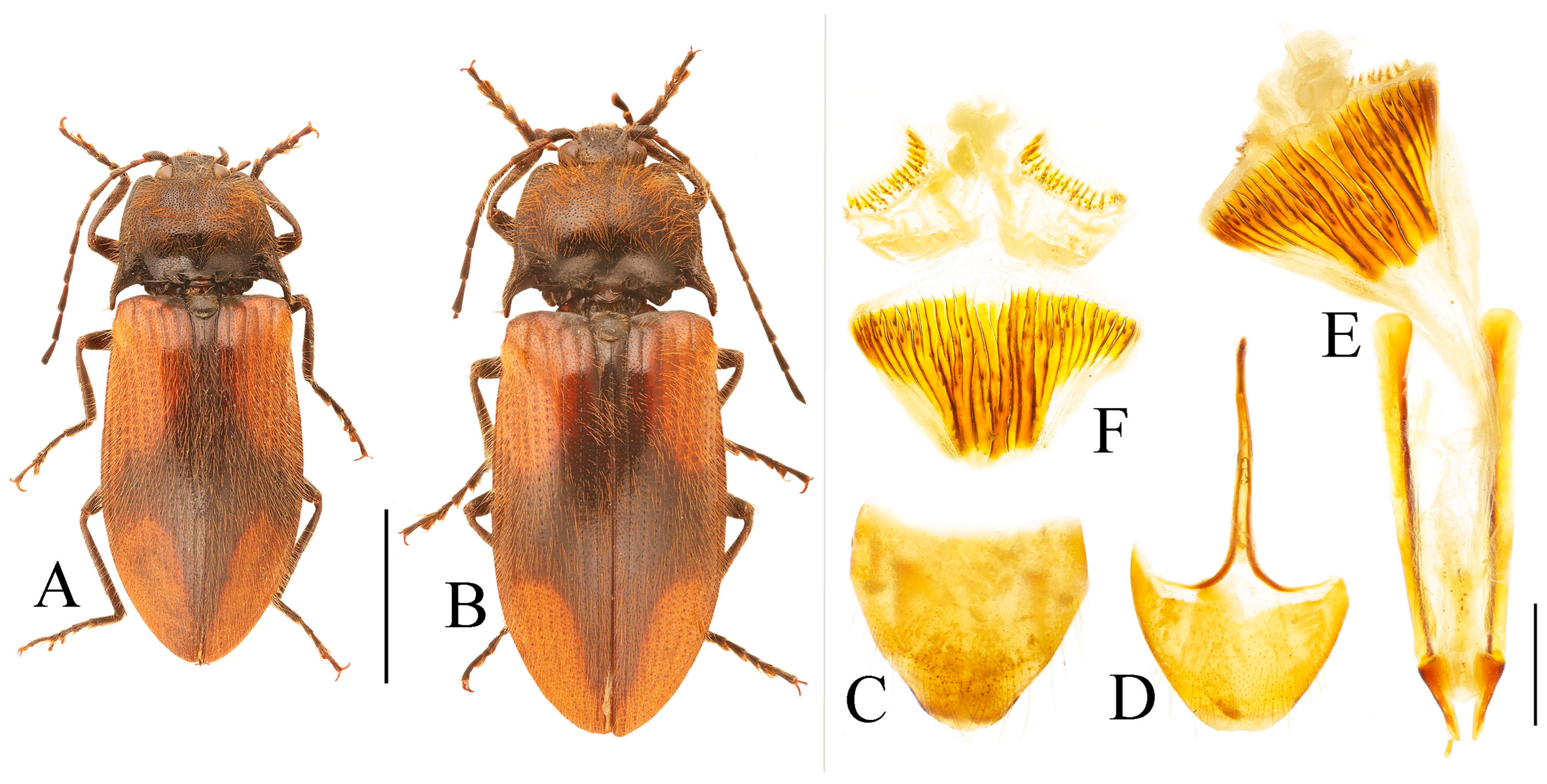 Body stout (elytra/pronotum length ratio = 3.6:1), bicolored, narrow, covered with moderately long pubescence. Head including antennae, mandibles, and maxillary palpi black. Pronotum, scutellar shield, and elytra reddish brown, with black margins; anterior and posterior angles of pronotum black, with apices slightly paler. Ventral side reddish brown, with all sclerites (e.g., prosternum, hypomeron, mesonotum, metaventrite, metacoxal plates, lateral margins of abdomen) bordered with black. Legs yellowish brown, joints between femora and tibiae darkened. Pubescence yellow (