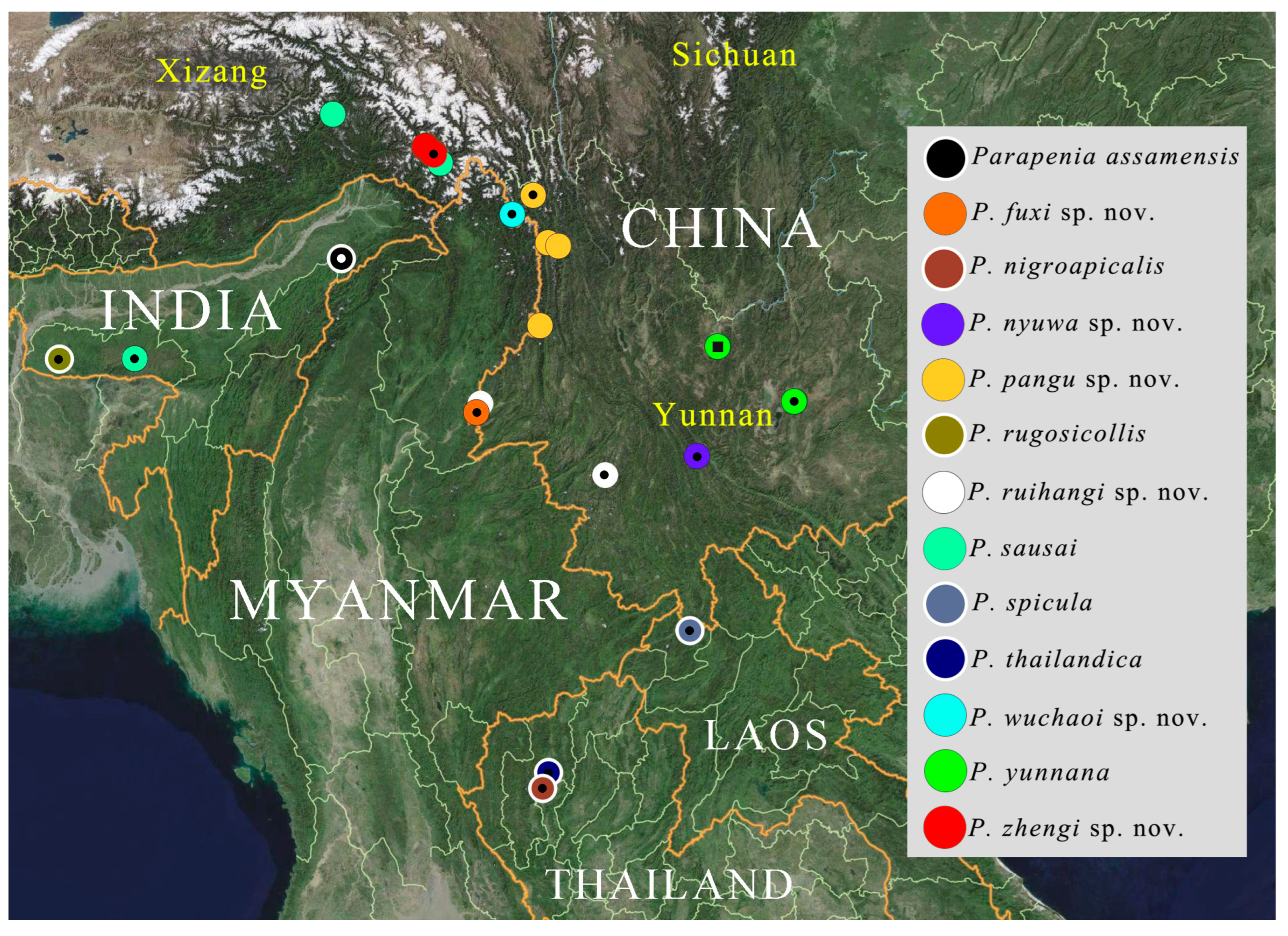 Type material examined. Holotype of Parapenia wulingshanensis Schimmel, 2006: male (NHMUK), “China, N Hunan, 4–7. VII./Wuling Shan, 29.4N 110.4E/ZHANGJIAJIE, ~700 m/Jaroslav Turna leg., 2003” [print], “Collection/R. Schimmel/Vinningen” [print], “Holotypus n. sp./Parapenia ♂/wulingshanensis/det. Schimmel 06” [print in red background, with handwriting for “♂” and “6”], “R. Schimmel coll./BMNH-E-2018-157/NHMUK013891159” [print, with a QR code]; paratypes of Parapenia wulingshanensis Schimmel, 2006: 3 males and 2 females (1 female in DEMSU; the rest in NHMUK), same data as holotype, NHMUK specimens with numbers NHMUK013891160–013891163.