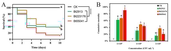 Bioassays of D. abietella larvae within 10 days after Bt infection. (A) Survival curves. Curves were drawn at concentrations of 1 × 108 CFU mL−1. Different letters indicate significant differences among groups (N = 60 larvae per group, pairwise log-rank test, p < 0.05). **** indicates p < 0.0001 between Bt treatments and CK (pairwise log-rank test). (B) Larval mortality rates. Mortality rates are given as mean ± SE (n = 3). Different letters indicate significant differences among groups under the same concentration (N = 60 larvae per treatment, Tukey’s post hoc test, p < 0.01).