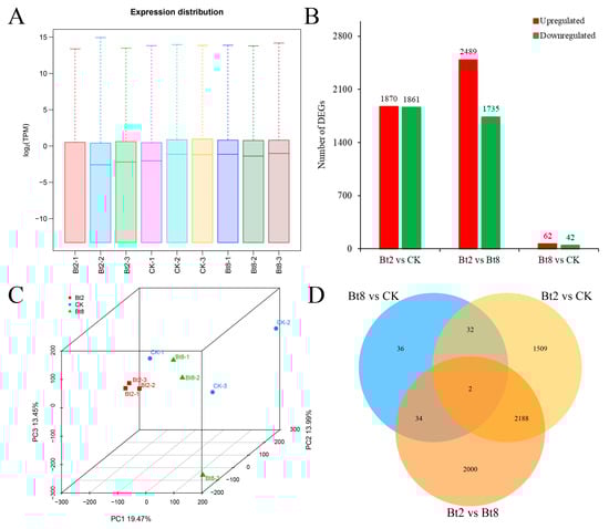 The DEGs among the groups (Bt2 vs. CK, Bt8 vs. CK and Bt2 vs. Bt8) were identified using the DEseq2 1.12.4 (R language, https://bioconductor.org/packages/release/bioc/html/DESeq2.html, accessed on 10 September 2024) [37] with the thresholds of qValue ≤ 0.05 and |log2FC(Fold change)| ≥ 1. Functional annotation and enrichment analysis of DEGs were performed on the basis of the GO and KEGG databases. The gene expression in samples was observed using Venn diagrams, boxplots, and principal component analysis (PCA).