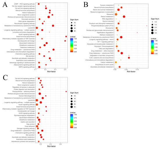 KEGG enrichment pathways of DEGs in D. abietella larvae at different days post-Bt05041 exposure. (A) The top 30 most significant KEGG pathways in the Bt2 vs. CK group. (B) The top 30 most significant KEGG pathways in the Bt8 vs. CK group. (C) The top 30 most significant KEGG pathways in Bt2 vs. Bt8 group. The x-axis and y-axis represent the Rich factor and the KEGG pathway, respectively.
