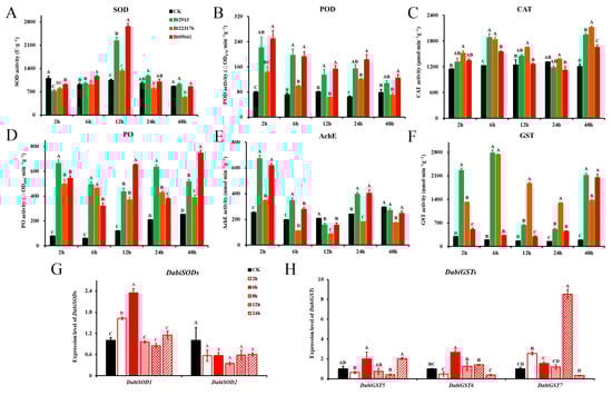 Bt exposure activated the activity of defensive enzymes and induced the gene expression of their genes. Enzyme activities of (A) SOD, (B) POD, (C) CAT, (D) PO, (E) AchE, and (F) GST after Bt2913, Bt223176, and Bt05041 treatment. Expression levels of (G) superoxide dismutase genes and (H) glutathione-S-transferase genes after feeding Bt05041 at different time points. Data are given as mean ± SE (n = 3). Different letters above bars indicate significant differences between time points (Tukey’s post hoc test, p < 0.01).