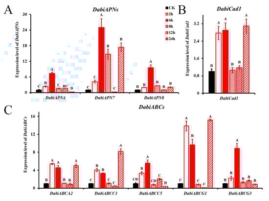Effects of Bt05041 on toxin-receptor genes expression in D. abietella larvae. (A) DabiAPNs. (B) DabiCad1. (C) DabiABCs. Data are given as mean ± SE (n = 3). Different letters above bars indicate significant differences between time points (Tukey’s post hoc test, p < 0.01).