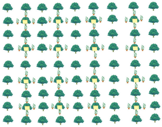 This component of the study was performed in an orchard in Xinhui, Guangdong Province, China, planted with Citrus reticulata “Chachi” trees of 2 y age, at a density of 4 × 5 m. Orange jasmines planted in pots with newly emerged adhesive-sprayed shoots were placed evenly in four directions beside the citrus trees. In each trial, orange jasmine traps were placed among four rows of trees, with four trees per row (Figure 1). Trees in each row were spaced at least two trees apart, and each row represented one replicate (four replicates with 16 trees). Replicates were spaced at least one row apart. One yellow sticky card (control) was placed on the trees in each direction. The number of ACP individuals on orange jasmine plants and sticky cards was counted after 24 h.