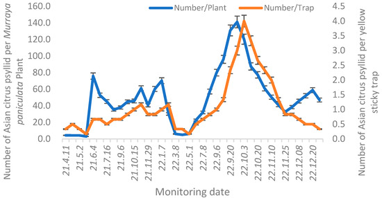 Dynamic detection of Asian citrus psyllid using Murraya paniculata adhesive and yellow sticky traps.