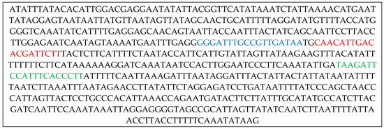Sequence of a 650 bp fragment of the cytB gene from P. italosignus (GeneBank: FJ664097.1), indicating the Sense Primer (in blue), the Anti-Sense Primer (in green), and the LNA probe (in red).