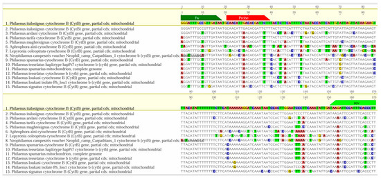 The software accurately determined the position of the LNA probe, covering all insects included in the study. Eurofins Genomics (Ebersberg, Germany) synthesized the oligonucleotides. At the same time, BLAST (https://blast.ncbi.nlm.nih.gov/Blast.cgi) analyzed the primers and probe design, searching for homologous nucleotide sequences and aligning them with the MAFFT software package [63], in Geneious version 2025.1.3 (Biomatters Ltd, Auckland, New Zealand; http://www.geneious.com). The alignments performed within the cytB gene involved 269 sequences belonging to Philaenus arslani (Abdul-Nour & Lahoud, 1996), Philaenus maghresignus (Drosopoulos & Remane, 2000), P. italosignus, P. spumarius, P. tesselatus, P. tarifa, P. signatus, N. campestris, Aphrophora alni (Fallén, 1805), and Lepyronia coleoptrata (Linnaeus, 1758). In Figure 2, we have simplified the alignments because many of the aligned sequences were repetitive and exhibited identical variability for the target sequence. The extended version, which includes all sequences considered, is provided in Figure S1 (Supplementary Materials).