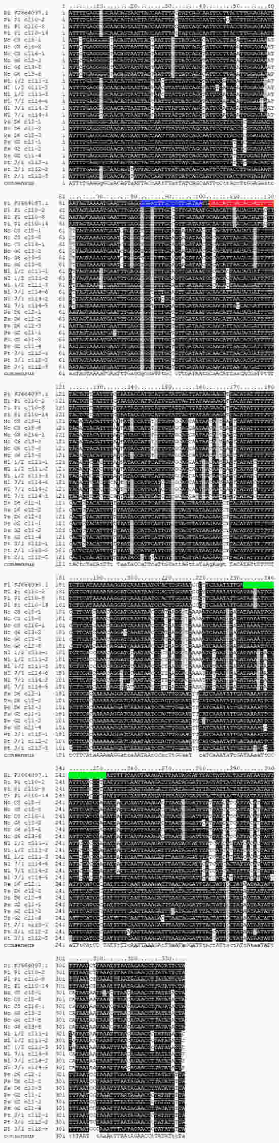 Alignment of 24 cytB alleles cloned from Neophilaenus campestris (Nc C8 and Nc G6), N. lineatus (Nl 1/2 and Nl 7/1), Philaenus spumarius (Ps D6 and Ps G2), P. italosignus (Pi P1), and P. tesselatus (Pt 2/1) specimens used to evaluate the existence of variability due to heteroplasmy, in the nucleotide sequence targeted by the qPCR assay developed in this study. A homologous sequence (FJ664097.1) of P. italosignus was retrieved in the GenBank database and included for comparative purposes. The positions of the P.italosignus-specific qPCR assay primers (fw and rv) and probe are highlighted in blue, green, and red, respectively.