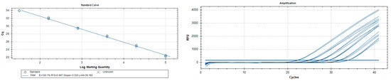 The repeatability and reproducibility of the assay are shown in Table 5 and Table 6. Eight DNA extracts (replicates) were assayed in triplicate at a concentration of 0.08 ng/µL. The range of repeatability values found was from 31.6 ± 0.15 to 32.0 ± 0.30 (Table 5), while the range for reproducibility was from 31.2 ± 0.10 to 31.7 ± 0.23 (Table 6).