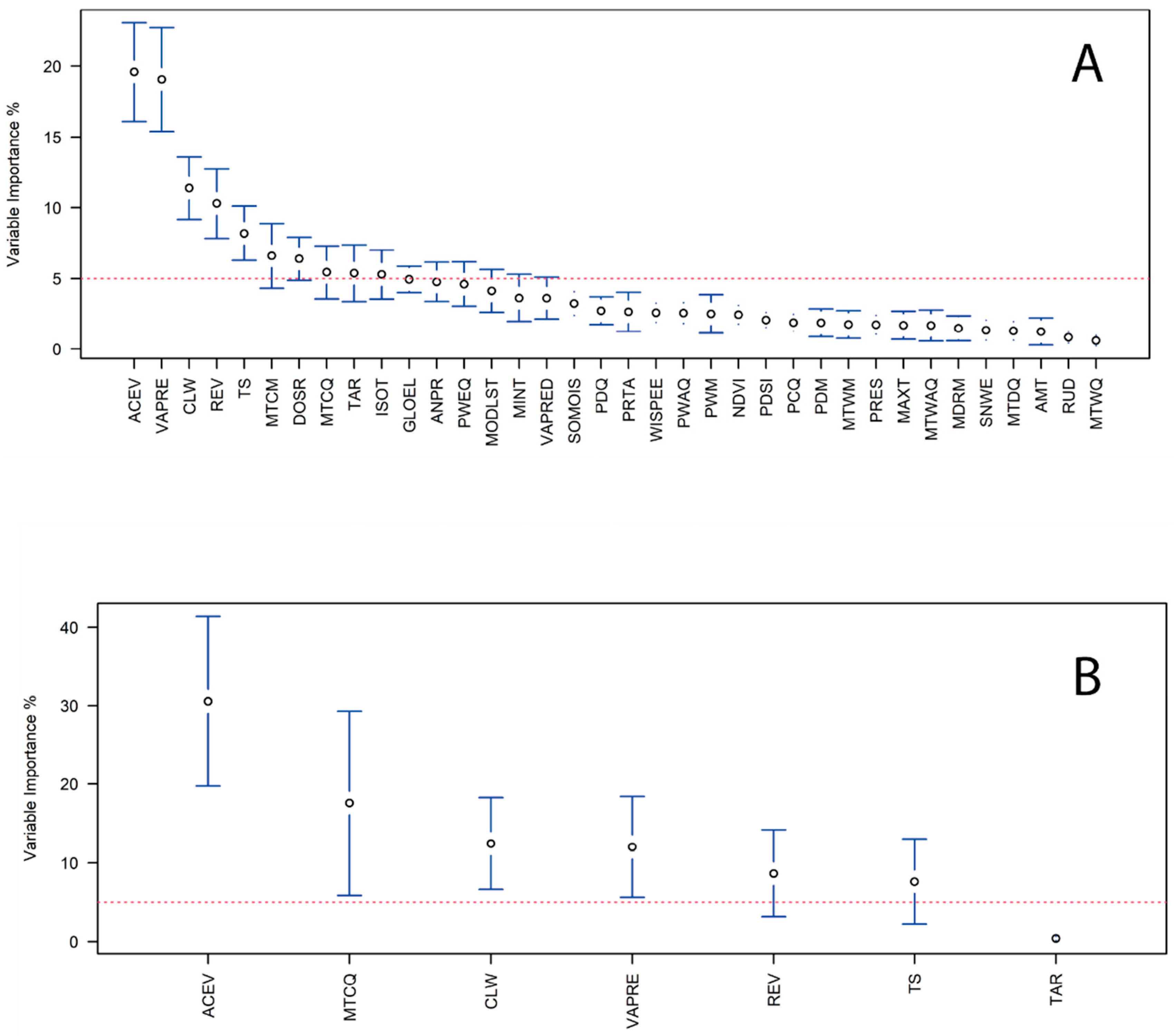 - Elith, J.; Ferrier, S.; Huettmann, F.; Leathwick, J. The Evaluation Strip: A New and Robust Method for Plotting Predicted Responses from Species Distribution Models. Ecol. Modell. 2005, 186, 280–289. [Google Scholar] [CrossRef]