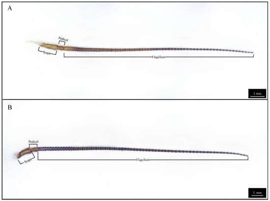 Additionally, antennae were carefully excised through standard dissection protocols from three adult male and three adult female Blaptica dubia cockroaches, with bilateral antennae from each individual being utilized in the study. All excised antennal samples were rinsed three times in 75% (v/v) ethanol and subsequently air-dried at room temperature (25 ± 1 °C). The prepared antennae were then mounted onto white filter paper and imaged in their entirety using a KS-X1500S 3D digital super-depth microscope (Nanjing Kaishimai Technology Co., Ltd., Nanjing, China).
