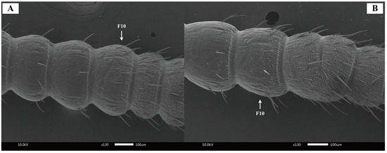 SEM micrographs were processed in Adobe Photoshop 2024 (Adobe Systems, San José, CA, USA) to optimize global contrast and uniform background without altering original morphological features. Antennal measurements were conducted using ImageJ software 1.54g (National Institutes of Health, USA).