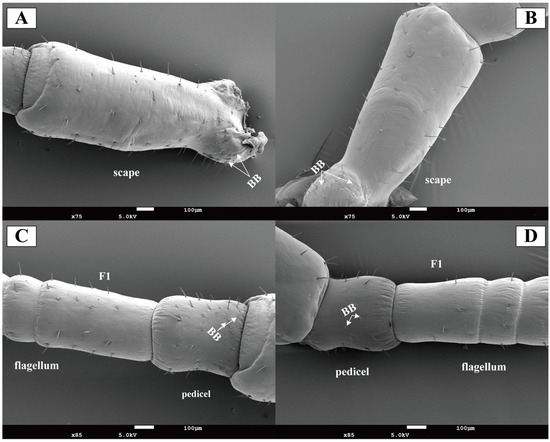19]. While the present study concentrates on the chemosensory functions of external sensilla, the potential synergistic mechanisms between Johnston’s organ as a crucial mechanosensory structure and the external chemosensory system merit further in-depth investigation in future research. Böhm’s bristles are primarily distributed on the scape, particularly in the antennal-head contact region, show significantly reduced occurrence on the pedicel, and are sparsely distributed in both male and female