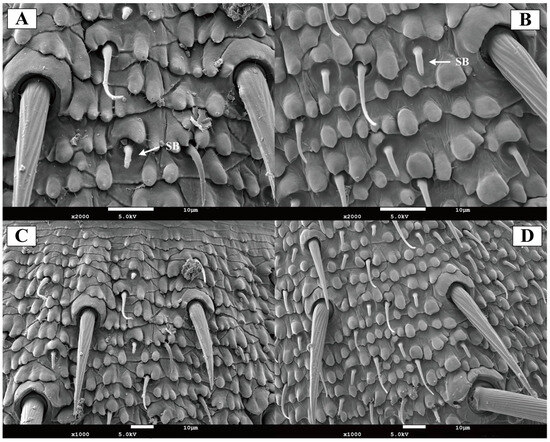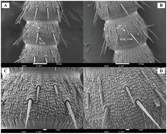 20]. Chaetic sensilla are morphologically segregated into two distinct types based on length differences: Type I and Type II. A pronounced sexual dimorphism was observed in