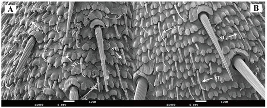 21]. This sexual dimorphism in Type I and Type II sensilla length supports the hypothesis that the elongated Type I and Type II sensilla in males may represent an adaptive specialization, enhancing chemosensory capabilities to optimize mate-searching efficiency and thereby conferring competitive reproductive advantages. Based on morphological characteristics, the trichoid sensilla can be classified into three distinct types: Type I, Type II, and Type III. Previous studies on