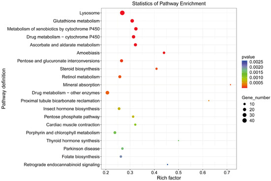 Blaptica dubia exhibits sexually dimorphic expression patterns of these chemosensory proteins in its antennal tissues. KEGG pathway enrichment analysis of DEGs revealed cytochrome P450-associated metabolic pathways among the top five most significantly enriched pathways. Notably, two cytochrome P450-associated pathways demonstrated particularly strong enrichment: “Drug metabolism—cytochrome P450 (map00982)” and “Metabolism of xenobiotics by cytochrome P450 (map00980)”. These results corroborate the oxidation-reduction process identified in the GO analysis, consistent with the established role of cytochrome P450 enzymes in pheromone catabolism across diverse insect taxa [