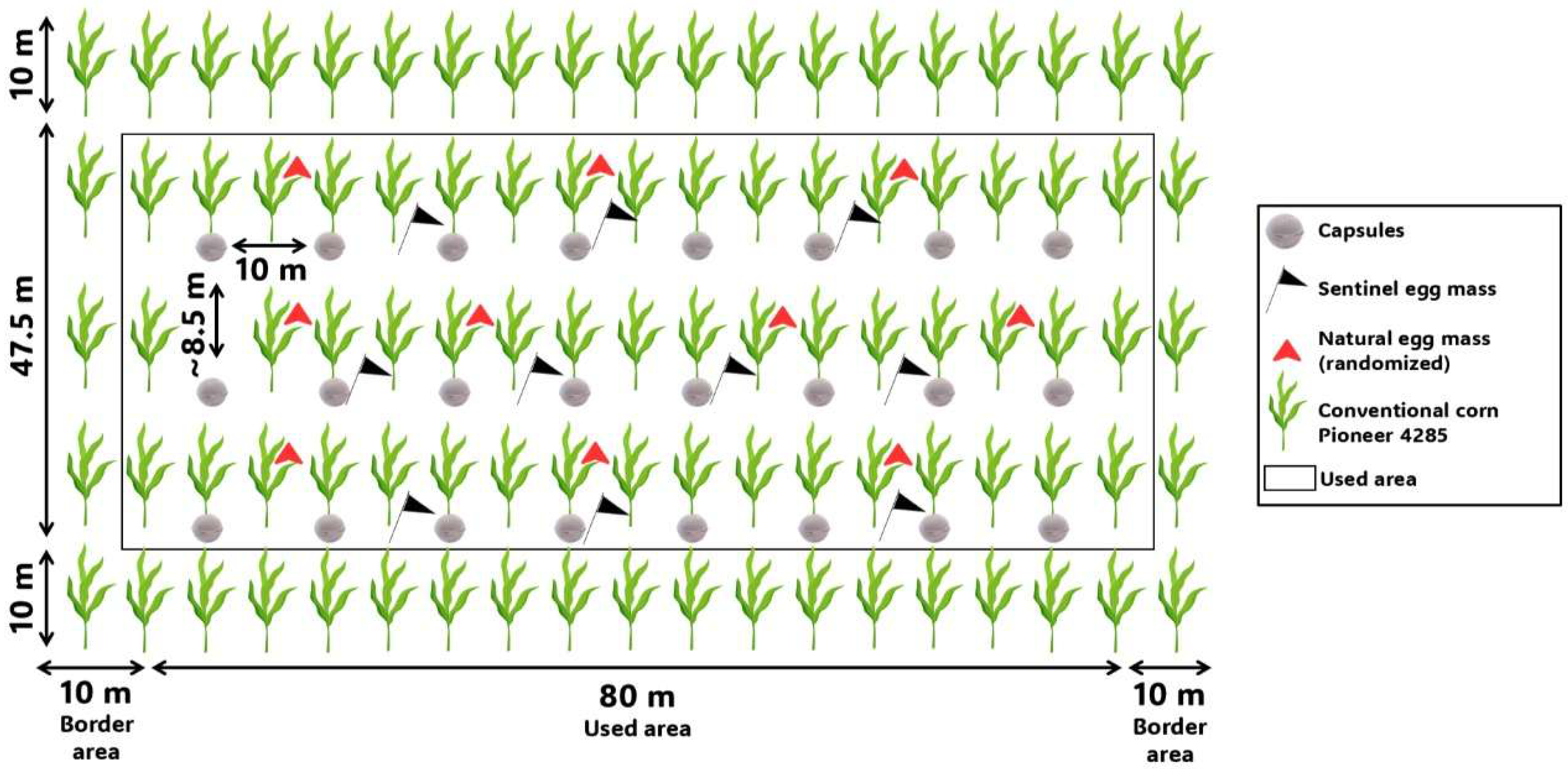 A baseline assessment was carried out before the first parasitoid release to evaluate the presence of natural parasitism in the area. Subsequently, parasitoids were released 3 times for each treatment plot, spaced from seven to ten days apart each release. Parasitoids were released as mated and honey-solid-fed adults, with 24–48 h post-emergence, ensuring that they were physiologically ready for host searching and parasitism. Adults were released inside biodegradable capsules, which were opened in the field at the time of release to allow the parasitoid dispersion. Capsules were evenly distributed across the field, with 35 release points per hectare [21]. In treatments with higher release densities, the number of capsules per hectare was proportionally increased, but the number of releasing points was kept the same (35 points/ha) to maintain homogeneous distribution and prevent capsules from being overcrowded.