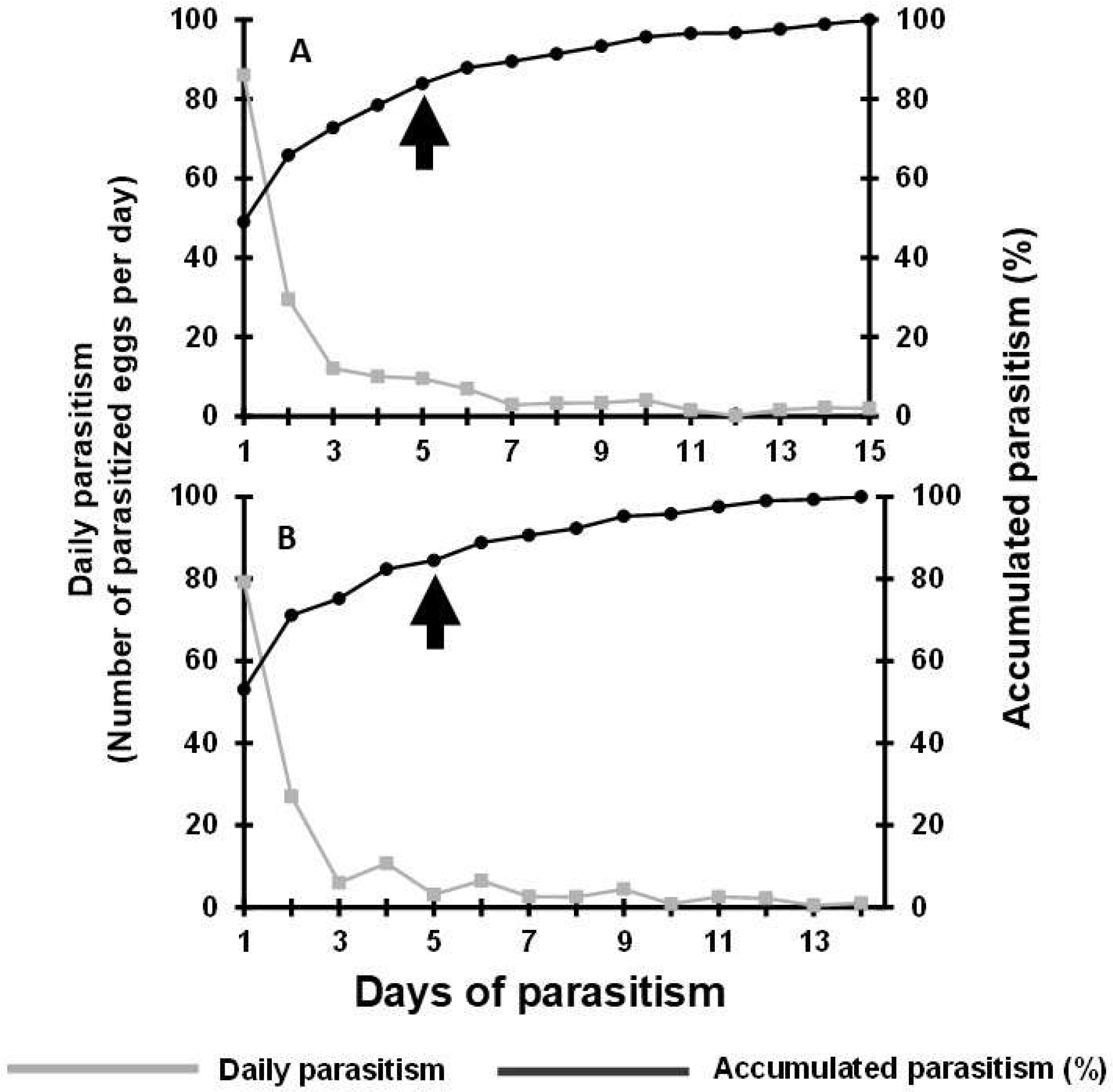 Figure 2. Parasitism capacity of Telenomus remus fed with honey-solid diet (A) and honey-droplet diet (B) on eggs of Spodoptera frugiperda. Arrows indicate 80% of total parasitism (accumulated parasitism%).