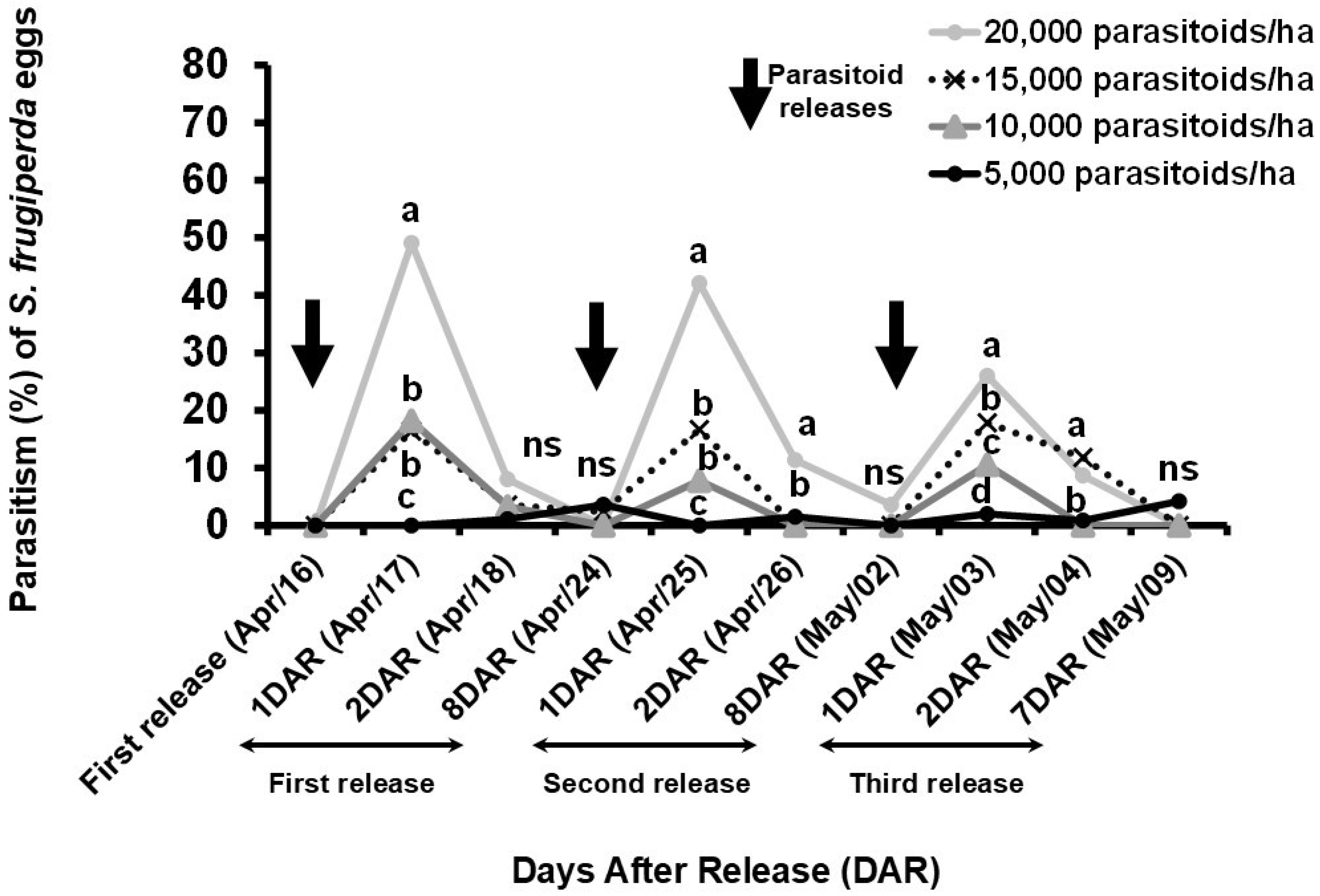 Figure 4. Release of different densities of Telenomus remus (parasitoids/ha) in maize during the second cropping season of 2024, conducted at the Embrapa Soja experimental field (Londrina, Paraná, Brazil) (experiment 3). Letters indicate significant differences among treatments on each date, based on generalized linear mixed models with binomial distribution and logit link, followed by pairwise comparisons using Tukey’s test on estimated marginal means (p < 0.05). Non-significant results were indicated as “ns” (p ≥ 0.05). Arrows indicate when the parasitoid was released.