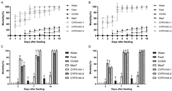 Mortality of Ae. albopictus fed with cyp314a1 and cyp315a1 RNAi recombinant Chlamydomonas. (A) Mortality of Ae. albopictus fed with cyp314a1 RNAi recombinant Chlamydomonas; (B) Mortality of Ae. albopictus fed with cyp315a1 RNAi recombinant Chlamydomonas; (C) Mortality of Ae. albopictus fed with cyp314a1 RNAi recombinant Chlamydomonas on days 3, 7 and 10 after feeding; (D) Mortality of Ae. albopictus fed with cyp315a1 RNAi recombinant Chlamydomonas on days 3, 7 and 10 after feeding.Water: larvae fed with water; Feed: larvae fed with feed; CC425: larvae fed with C. reinhardtii CC425; Maa7: larvae fed with empty plasmid pMaa7IR/XIR transgenic C. reinhardtii CC425; CYP314A-1 to CYP314A-3: larvae fed with pMaa7IR/cyp314a1IR transgenic C. reinhardtii CC425 lines. CYP315A-1 to CYP315A-3: larvae fed with pMaa7 IR/cyp315a1IR transgenic C. reinhardtii CC425 lines. Each treated or control group contained ten Aedes larvae, and the experiments were performed in triplicate for 10 days. Data are expressed as the mean ± SD (n = 3), and significant differences (p < 0.05, Duncan’s multiple range test) are indicated by different letters.