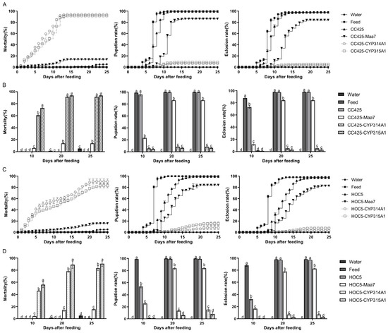 Mortality, pupation, and eclosion rates of Ae. albopictus fed with cyp314a1 and cyp315a1 RNAi recombinant Chlamydomonas (A,B) and Chlorella (C,D). Water: larvae fed with water; Feed: larvae fed with feed; CC425: larvae fed with C.reinhardtii CC425; HOC5: larvae fed with wild C. vulgaris HOC5; CC425-Maa7 and HOC5-Maa7: larvae fed with an empty Maa7IR/XIR plasmid in transgenic Chlorella or Chlamydomonas; CC425-CYP314A1 and CC425-CYP315A1: larvae fed with cyp314a1 and cyp315a1 RNAi recombinant Chlamydomonas and Chlorella lines. HOC5-CYP314A1 and HOC5-CYP315A1: larvae fed with cyp314a1 and cyp315a1 RNAi recombinant Chlorella lines. Each treated or control group contained 300 Aedes larvae, and the experiments were performed in triplicate over 25 days. Data are expressed as the mean ± SD (n = 3), and significant differences (p < 0.05, Duncan’s multiple range test) are indicated by different letters.