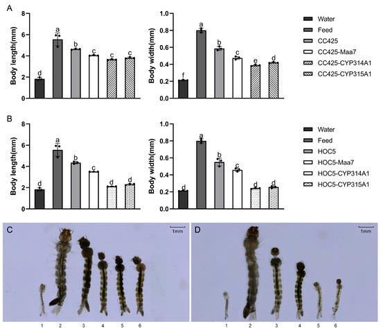 Length and width of larvae. The length and width of L3 larvae from each treatment were measured. (A,C), larvae fed with recombinant Chlamydomonas strains; (B,D), larvae fed with recombinant Chlorella strains. (C,D), 1, larvae fed water; 2, larvae fed feed; 3, larvae fed C. reinhardtii CC425 (C) or C. vulgaris HOC5 (D); 4, larvae fed with empty plasmid Maa7IR/XIR transgenic Chlamydomonas (C) or Chlorella (D) strain; 5 and 6, larvae fed with recombinant Chlamydomonas (C) or Chlorella (D) strain. Water: water was fed to the larvae; Feed: larvae fed feed; CC425: larvae fed C. reinhardtii CC425; HOC5: larvae fed wild Chlorella vulgaris HOC5; CC425-Maa7 and HOC5-Maa7: larvae fed with empty plasmid Maa7IR/XIR transgenic Chlorella or Chlamydomonas strains; CC425-CYP314A1 and CC425-CYP315A1: larvae fed with recombinant Chlamydomonas strains. HOC5-CYP314A1 and HOC5-CYP315A1: larvae fed with recombinant Chlorella strains. Data are expressed as the mean ± SD (n = 3), and significant differences (p < 0.05, Duncan’s multiple range test) are indicated by different letters.