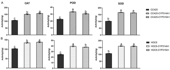 Analysis of CAT, POD and SOD enzyme activities in Aedes larvae after feeding on recombinant Chlamydomonas (A) and Chlorella (B) strains. CC425: larvae fed with C. reinhardtii CC425; HOC5: larvae fed with C. vulgaris HOC5; CC425-CYP314A1 and CC425-CYP315A1: larvae fed with recombinant Chlamydomonas strains; HOC5-CYP314A1 and HOC5-CYP315A1: larvae fed with recombinant Chlorella strains. Data are expressed as the mean ± SD (n = 3), and significant differences (p < 0.05, Duncan’s multiple range test) are indicated by different letters.