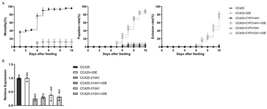 20E compensation test. (A) Mortality, pupation, and eclosion rates of Ae. albopictus fed with cyp314a1 and cyp315a1 RNAi recombinant Chlamydomonas with or without 20E; (B) The relative cyp314a1 and cyp315a1 mRNA levels in L3 larvae fed with recombinant Chlamydomonas with or without 20E. CC425: larvae fed C. reinhardtii CC425; CC425+20E: larvae fed with C. reinhardtii CC425 and 20E; CC425-CYP314A1 and CC425-CYP315A1: larvae fed with recombinant Chlamydomonas strains. CC425-CYP314A1+20E and CC425-CYP315A1+20E: larvae fed with the recombinant Chlamydomonas strains and 20E. Data are expressed as the mean ±SD (n = 3), and significant differences (p < 0.05, Duncan’s multiple range test) are indicated by different letters.