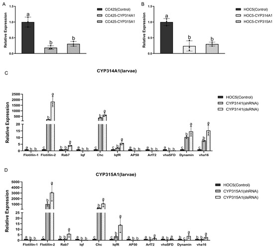 Furthermore, an evaluation was conducted of the levels of several gene transcripts involved in the clathrin-mediated endocytosis (CME) pathway (Supplementary Table S5). These include coat assembly proteins (clathrin adapter AP50 and clathrin heavy chain [Chc]), vesicle formation and budding proteins (liquid facets [lqf], liquid facets-related [lqfR], and dynamin), early endosome proteins (Vha16 and VhaSFD), endosome maturation protein Rab7 and ADP-ribosylation factor-like 1 (Arf72A). Two genes of the flotillin-mediated endocytosis pathway are also included flot-1 and flot-2. The results demonstrated that the mRNA levels of flot-2, Rab7, Chc, Dynamin and vha16 were significantly increased in larvae fed with cyp314a1 shRNA or recombinant Chlorella dsRNA (Figure 6C). Furthermore, the mRNA levels of flot2, Rab7, Chc, lqfR, Dynamin and vha16 were also found to be significantly increased in larvae fed with cyp315a1 shRNA or recombinant Chlorella dsRNA (Figure 6D). These results suggested that knockdown of cyp314a1 or cyp315a1 influences the expression of CME pathway-related genes more than feeding with ds/shRNA-free Chlorella does.