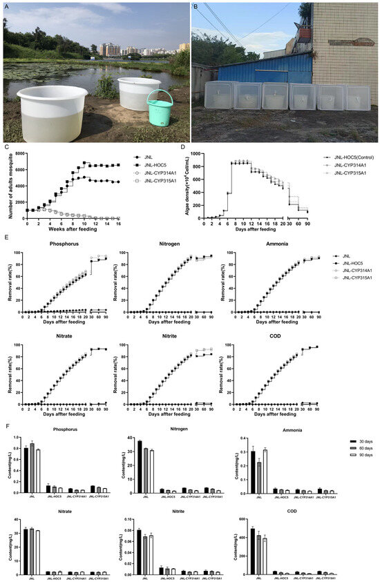 Simulated-field trials in the suburban of Haikou. Test water was taken from Jinniu Ling reservoir (A). 200 L of C. vulgaris HOC5 were mixed with 600 L of the Jinniu Ling reservoir water in the barrel. Approximately 1000 L1 larvae were placed in each cage, and the number of adult Ae. albopictus was counted once a week (B). The population and survival rates of Ae. albopictus in the JNL (control), JNL-HOC5 (control), JNL-CYP314A1 and JNL-CYP315A1 treatment groups are shown in (C). Relative abundance of Chlorella in the JNL-HOC5 (control), JNL-CYP314A1 and JNL-CYP315A1 treatment groups (D). The removal rates of nitrogen, phosphorus, nitrate, nitrite, ammonia, and COD by RNAi recombinant Chlorella (E). Nitrogen, phosphorus, nitrate, nitrite, ammonia, and COD content in the JNL-HOC5 (control), JNL-CYP314A1 and JNL-CYP315A1 treatment groups (F). JNL: The mosquito lived in water from the Jinniu Ling reservoir alone. JNL-HOC5: The mosquito lived in water from the Jinniu Ling reservoir that was supplemented with wild Chlorella HOC5. JNL-CYP314A1 and JNL-CYP315A1: the mosquito lived in water from the Jinniu Ling reservoir that was supplemented with recombinant Chlorella HOC5-CYP314A1 and HOC5-CYP315A1.