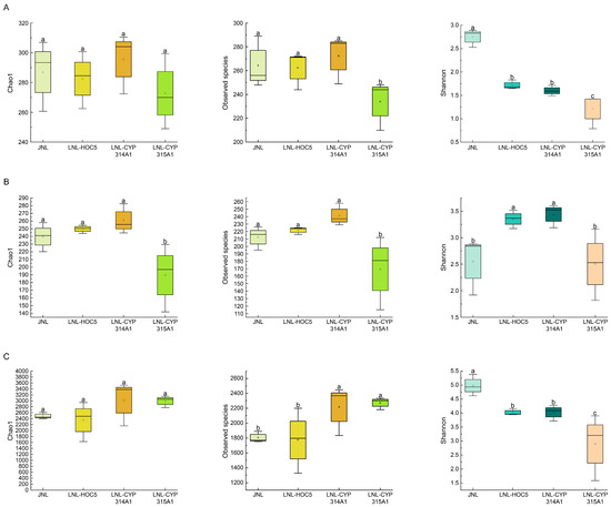 Box plots showing the differences between groups in the Chao1 index, the observed species index and the Shannon index for phytoplankton (A), zooplankton (B) and prokaryotes (C). JNL: water samples from Jinniu Ling Reservoir; JNL-HOC5: water samples from Jinniu Ling Reservoir with wild Chlorella HOC5 added; JNL-CYP314A1: water samples from Jinniu Ling Reservoir with RNAi recombinant Chlorella HOC5-CYP314A1 added; JNL-CYP315A1: water samples from Jinniu Ling Reservoir with RNAi recombinant Chlorella HOC5-CYP315A1 added. Data are expressed as the mean ± SD (n = 3), and significant differences (p < 0.05, Duncan’s multiple range test) are indicated by different letters.