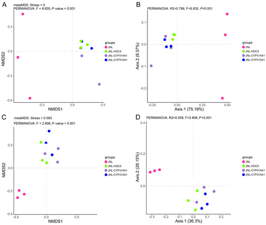 NMDS2 and PCA analyses of eukaryote (A,B) and prokaryote (C,D) JNL: water samples from Jinniu Ling Reservoir; JNL-HOC5: water samples from Jinniu Ling Reservoir with wild Chlorella HOC5 added; JNL-CYP314A1: water samples from Jinniu Ling Reservoir with RNAi recombinant Chlorella HOC5-CYP314A1 added; JNL-CYP315A1: water samples from Jinniu Ling Reservoir with RNAi recombinant Chlorella HOC5-CYP315A1 added.