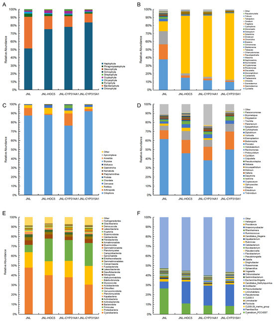 A total of ten groups of eukaryotic microalgae were identified at the phylum level in the Jinniu Ling Reservoir (JNL, control) sample, including Chlorophyta, Chrysophyta, Cryptophyta, Bacillariophyta, Pyrrophyta, Streptophyta, Ochrophyta, Phragmoplastophyta, Glaucophyta and Haptophyta (Supplementary Table S6). Of these, 366 OTUs within 83 genera were identified in JNL. Chlorophyta exhibited the highest number of OTUs. A total of 120 OTUs were identified within 28 genera of Chlorophyta. The second largest class was Chrysophyta, comprising 72 OTUs within 15 genera. Cryptophyta, Bacillariophyta and Pyrrophyta also exhibited a relatively high number of OTUs. By contrast, Phragmoplastophyta, Glaucophyta and Haptophyta exhibited lower numbers of OTUs (Supplementary Table S6). In the Jinniu Ling Reservoir water plus Chlorella HOC5 group (JNL-HOC5), 356 OTUs belonging to 86 genera were observed. Chlorophyta exhibited the highest number of OTUs, with 126 across 27 genera. As shown in Supplementary Table S6, Chrysophyta was the second largest phylum, comprising 63 OTUs across 17 genera. In the JNL-CYP314A1 treatment group, 383 OTUs belongs to 92 genera were observed. This was a greater number than in the JNL or JNL-HOC5 control groups. Of these, the number of Cryptophyta, Bacillariophyta and Streptophyta species increased. However, the JNL-CYP315A1 treatment group exhibited a mere 334 OTUs across 80 genera, falling short of the OTUs and genera observed in the control groups (JNL, or JNL-HOC5). Regarding species abundance, Chlorophyta, Bacillariophyta, Pyrrophyta, Chrysophyta and Cryptophyta were found to be more prevalent in the treatment groups (JNL-CYP314A1 and JNL-CYP315A1) and in the control group (JNL, JNL-HOC5). Compared with the control group, the relative abundance of Bacillariophyta, Pyrrophyta and Chrysophyta decreased in the treatment group, while the relative abundance of Chlorophyta increased (Figure 10A).