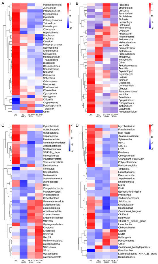 Heat map analysis of phytoplankton at genus level (A), zooplankton at genus level (B), prokaryotes at phylum level (C), and prokaryotic at genus level (D) in simulated field test water. JNL: water samples from the Jinniu Ling Reservoir; JNL-HOC5: water samples from the Jinniu Ling Reservoir with wild Chlorella HOC5 added; JNL-CYP314A1: water samples from the Jinniu Ling Reservoir with RNAi recombinant Chlorella HOC5-CYP314A1 added; JNL-CYP315A1: water samples from the Jinniu Ling Reservoir with RNAi recombinant Chlorella HOC5-CYP315A1 added.