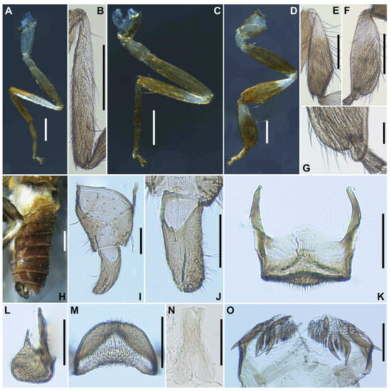 Male of S. sipoense sp. nov. (A) Foreleg; (B) Fore tibia; (C) Midleg; (D) Hind leg; (E) Hind tibia; (F) Hind basitarsus; (G) Calcipala; (H) Abdomen, lateral view; (I) Coxite and style, ventral view; (J) Style, dorsolateral view; (K–M) Ventral plates, ventral (K), lateral (L), and caudal (M) view; (N) Median sclerite; (O) Parameres. Scale bars: 0.2 mm for (A–F,H) and 0.05 mm for (G,I–O).