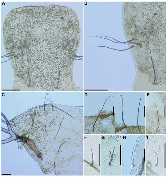 Pupa (n = 6). Body length 3.1–3.4 mm (mean 3.3 mm). Head. Integument yellow (Figure 5A), densely covered with small round tubercles, except antennal sheaths. Frons with 3 pairs of unbranched long trichomes (Figure 5B); face with pair of unbranched long trichomes (Figure 5B); 3 frontal trichomes on each side arising close together, subequal in length to one another, and somewhat as long as facial one. Thorax. Integument yellow (Figure 5C), moderately covered by round tubercles on anterior lateral portion and posterior half somewhat sparsely covered with small tubercles, with 3 long dorsomedial trichomes (Figure 5D), 2 long anterolateral trichomes (Figure 5E), 1 unbranched (Figure 5F) or branched (Figure 5G) medium-long mediolateral trichome, and 3 ventrolateral trichomes with uncoiled apices (1 medium-long (Figure 5H), 2 short (Figure 5I)) on each side; all trichomes unbranched.