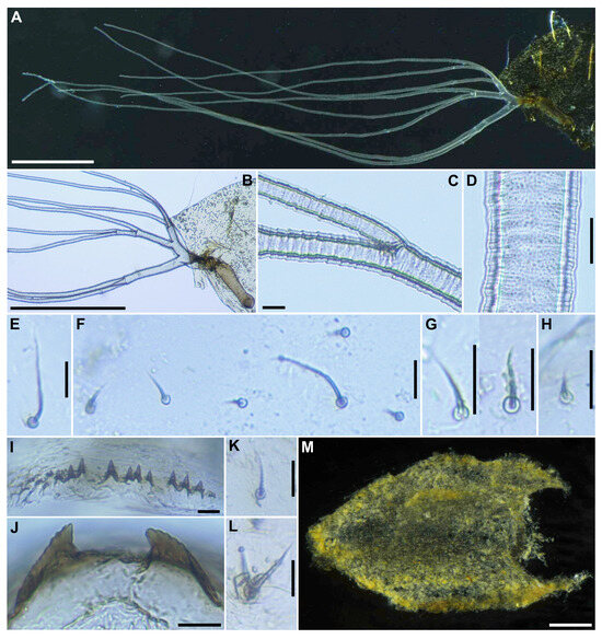 Gill (Figure 6A) composed of 8 slender thread-like filaments, arranged as [(2+1)+(1+2)]+2 from dorsal to ventral, with short common basal stalk (Figure 6B) having somewhat swollen transparent basal fenestra at base; common basal stalk 0.67 times length of interspiracular trunk (Figure 6B); dorsal and middle triplets sharing short stalk; dorsal triplet (Figure 6B) composed of 2 paired and 1 individual filaments with short primary and secondary stalks; middle triplet (Figure 6B) composed of 1 individual and 2 paired filaments with medium-long primary and short secondary stalks; ventral paired filaments (Figure 6B) with long stalk 1.4–1.6 times length of common basal stalk and as long as interspiracular trunk; all filaments light yellow, gradually tapered toward apex; 2 filaments of ventral pair subequal in length (ca. 3.2 mm including their own stalk) to each other, 6 filaments of dorsal and middle triplets subequal in length to one another, and slightly shorter than 2 filaments of ventral pair; filaments of ventral pair subequal in thickness to each other; primary stalk of dorsal triplet lying against stalk of ventral pair at angle of about 80 degrees when viewed laterally; cuticle of all filaments with well-defined annular ridges (Figure 6C), densely covered with micro-tubercles (Figure 6D). Abdomen. Dorsally, all segments unpigmented or light yellow, without micro-tubercles; first segment with 1 slender medium long hair-like seta (Figure 6E) on each side; segment 2 with 1 slender long hair-like seta and 5 short spinous setae submedially on each side (Figure 6F), all setae unbranched; segments 3 and 4 each with 4 hooked spines and 1 unbranched short seta (Figure 6G) on each side; segment 5 with 3 short setae (Figure 6H) submedially on each side; segments 6–9 each with spine-combs in transverse row (Figure 6I) (though those on segment 9 somewhat smaller than those on all other segments) and comb-like groups of micro-spines on each side; segment 9 with pair of wide, plate-like terminal hooks (Figure 6J), with their outer margins 3.3–3.5 times as long as their inner margins and crenulated. Ventrally, segment 4 with 1 unbranched slender short seta (Figure 6K) on each side; segment 5 with pair of bifid hooks (Figure 6L) submedially and few unbranched slender short setae on each side; segments 6 and 7 each with pair of bifid inner and unbranched outer hooks, and few unbranched slender short setae on each side; segments 4–8 with comb-like groups of micro-spines. Each side of segment 9 with 3 grapnel-shaped hooklets. Cocoon (n = 6). Length 2.8–3.1 mm (mean 3.0 mm), width 1.9–2.2 mm (mean 2.6 mm) (Figure 6M). Wall pocket-shaped, moderately woven, somewhat extended ventrolaterally and without anterodorsal portion; posterior half with floor roughly or moderately woven; individual threads visible or not.