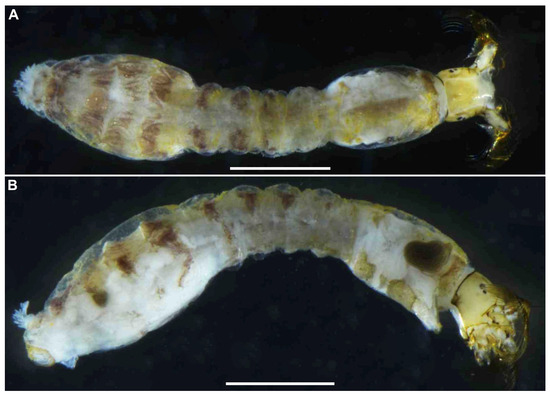 Larva of S. sipoense sp. nov. (A,B) Whole body, dorsal (A) and lateral (B) view. Scale bars: 1 mm.